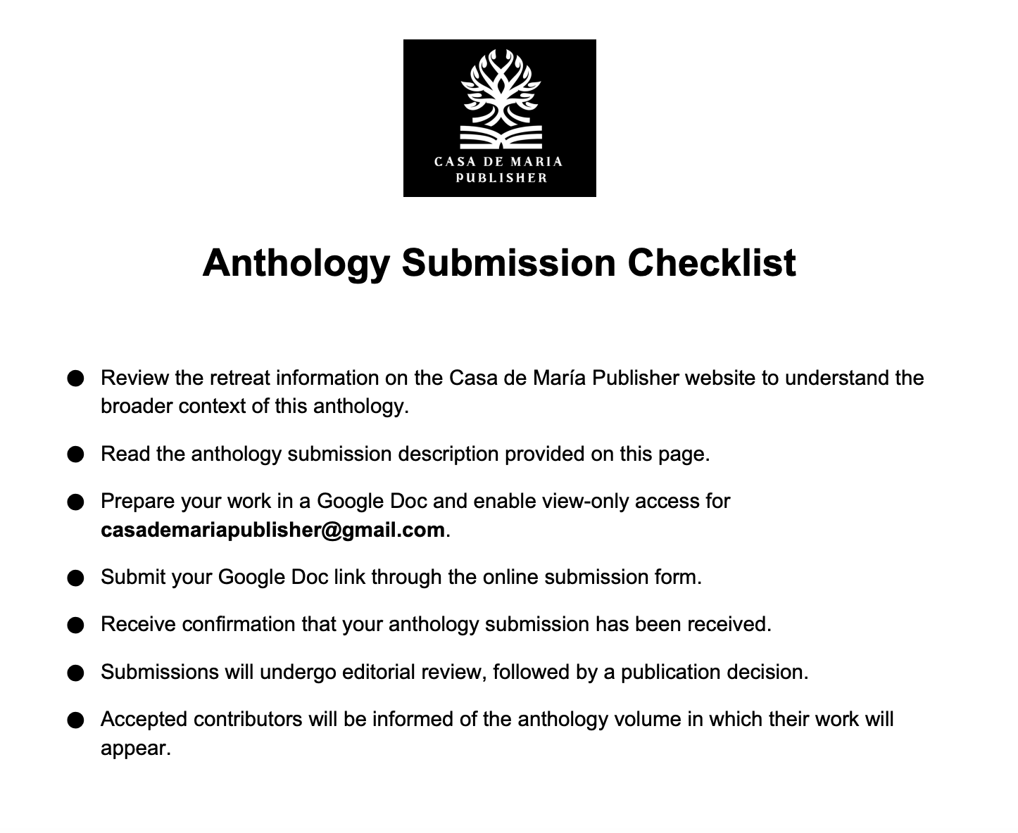 Casa de María Publisher approaches anthology work as a collaborative editorial process. Submissions are reviewed with respect for the writer’s voice and the context in which the work was created. Writers selected for inclusion will be guided through a transparent editorial process that honors both creative integrity and professional standards.