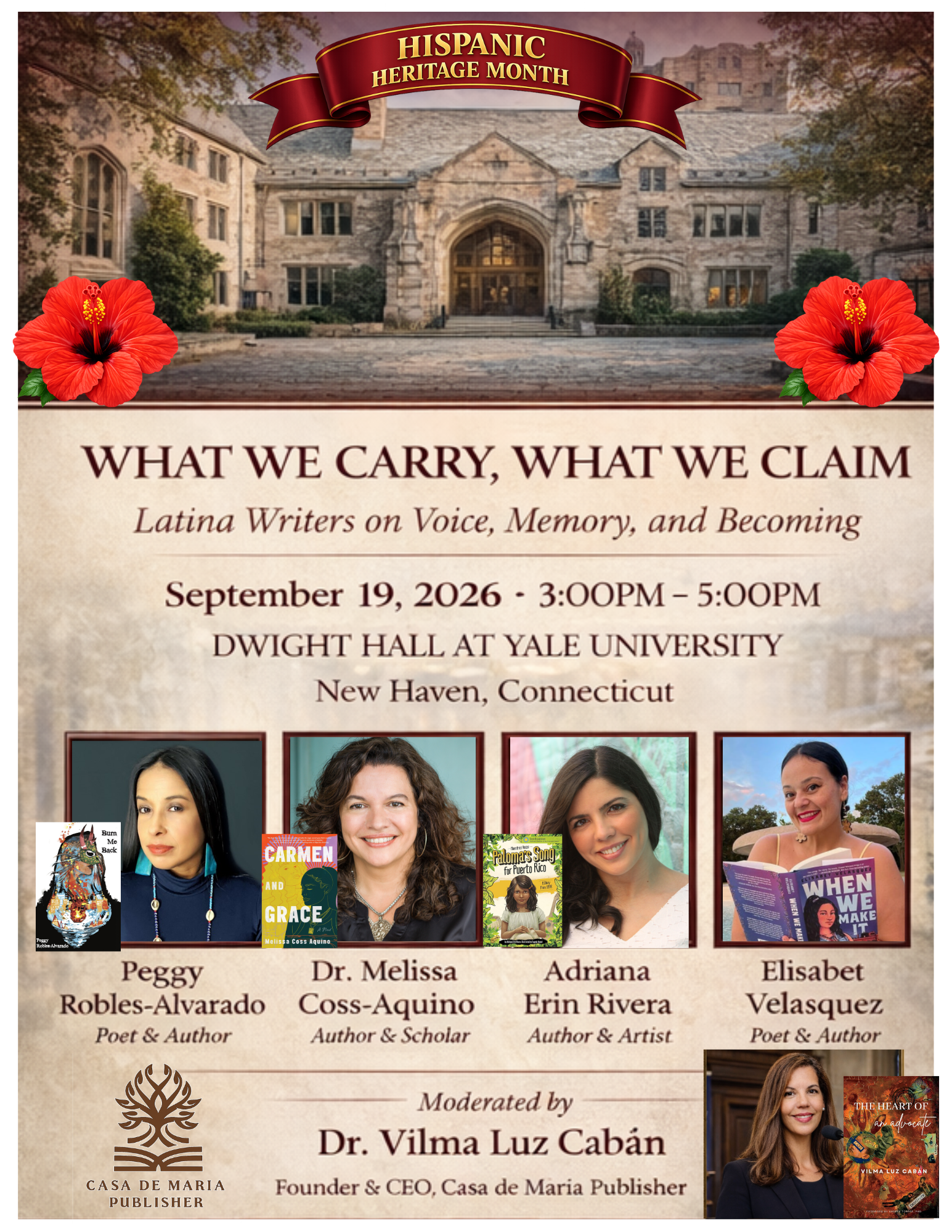 What We Carry, What We Claim: Latina Writers on Voice, Memory, and Becoming is a free public literary program organized by Casa de María Publisher in observance of Hispanic Heritage Month. The program will take place at Dwight Hall at Yale University.