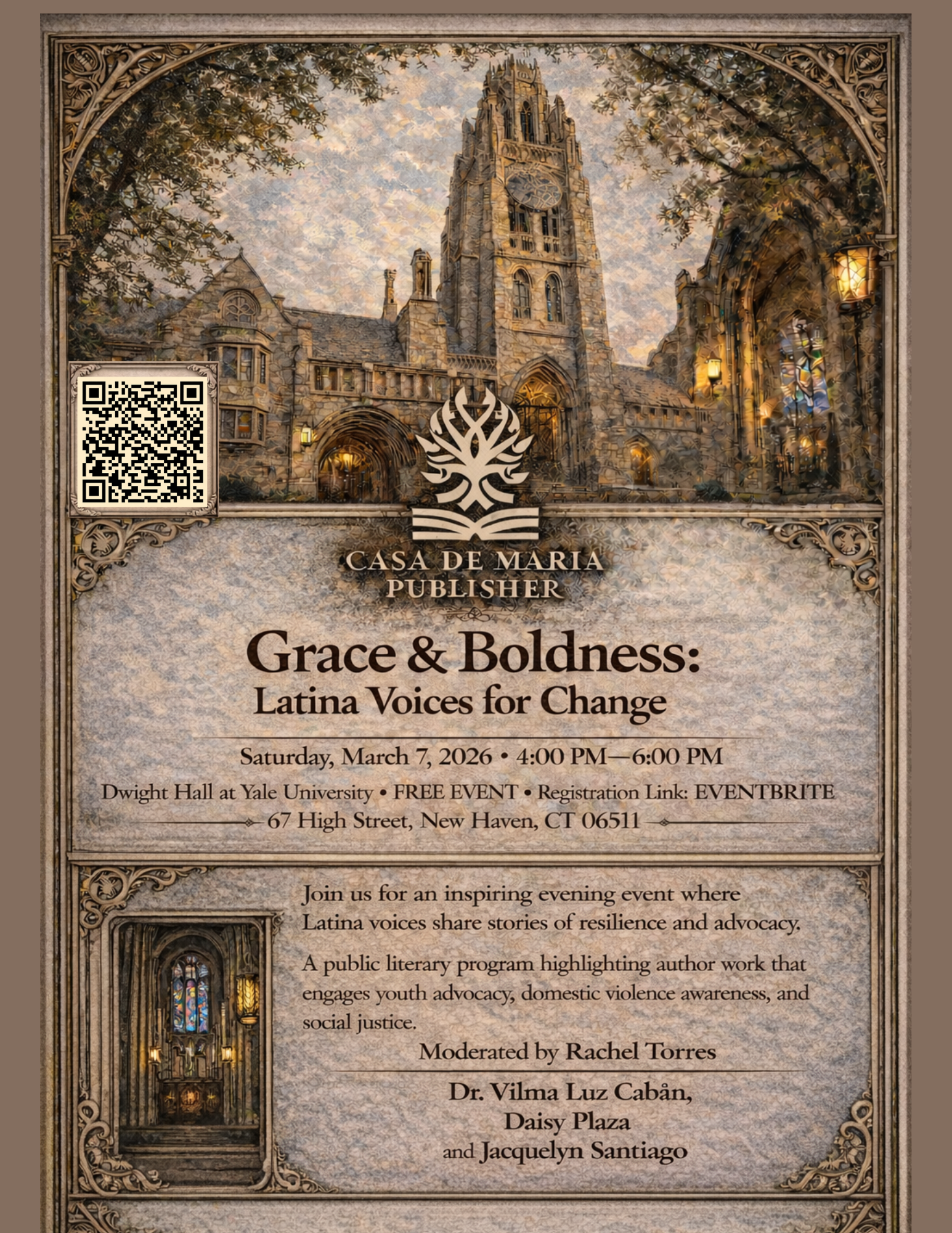 During Women’s History Month, Casa de María Publisher will present Grace and Boldness: Latina Voices for Change. The program will take place at the Dwight Hall Center for Public Service and Social Justice, Yale University, in New Haven, Connecticut.
