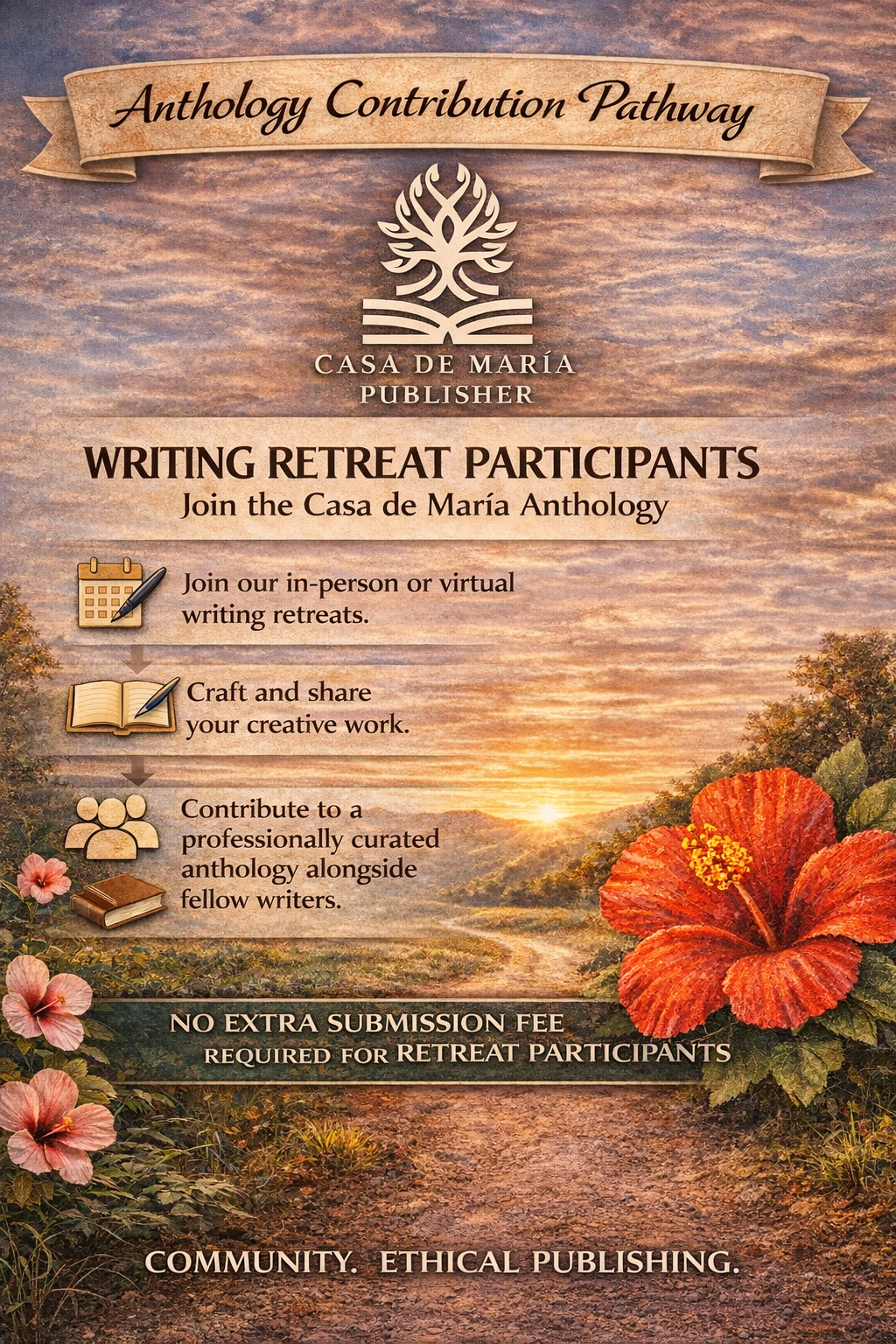The Writers Retreat Edition features work by writers who have participated in Casa de María Publisher’s in-person writing retreats, free webinar series, or subscription-based webinar offerings. Contributions emerge from sustained engagement with writing through these programs.